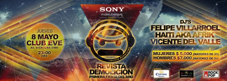 Este jueves 8 de mayo, déjalo reservado, porque REVISTA DEMOLICIÓN y SONY te invitan a su primera fiesta del año y lanzamiento de su nueva edición 73 en el Club Eve (Avenida Vitacura 5480)! No te la puedes perder porque tendrá a los mejores DJ's como Felipe Villarroel, Haiti (aka Afrik) y Vicente del Valle, en un ambiente increíble!