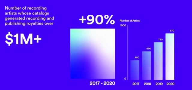 Loud & Clear ofrece distintos recursos con ese fin, incluyendo un video que se llama “Loud & Clear: Cómo Fluye el Dinero”, y una sección con varios gráficos que detallan cuántos artistas tienen cuántos ingresos en Spotify. De acuerdo a los datos, 870 artistas generaron por cada uno alrededor de $1 millón de dólares por derechos de autor en cuanto a grabaciones y publicaciones en el año 2020; 1.820 generaron sobre $500 mil dólares; 7.800 generaron sobre $100 mil; y 13.400 generaron sobre $50 mil.
