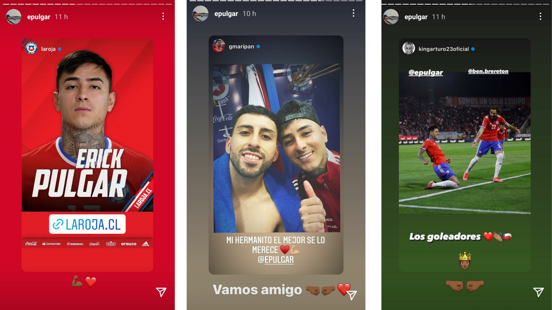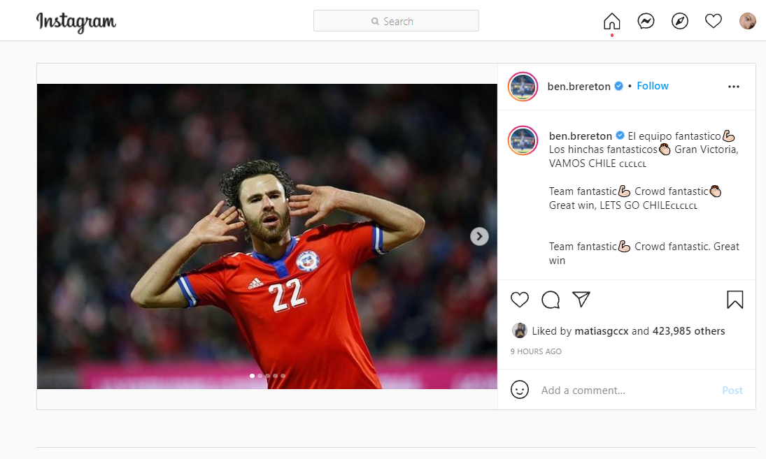 El nuevo chico favorito subió a su cuenta de Instagram fotos del partido y escribió "El equipo fantastico💪🏻 Los hinchas fantasticos👏🏻 Gran Victoria, VAMOS CHILE 🇨🇱🇨🇱🇨🇱".