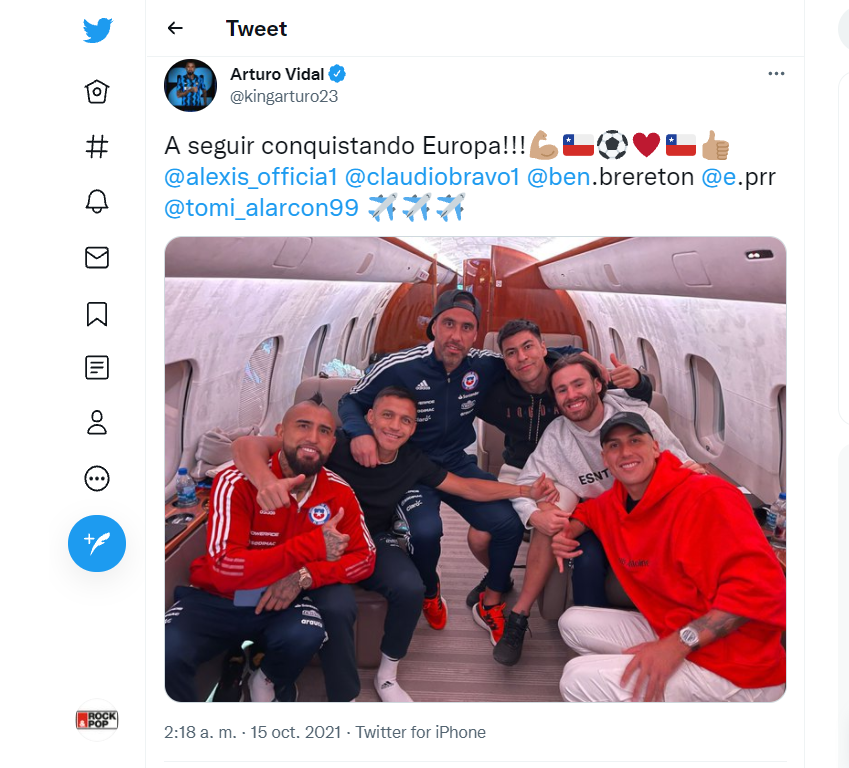 En el caso de Arturo Vidal, que se regresó de inmediato a Europa, compartió una foto a través de su cuenta en Twitter. En ella lo vemos junto a sus compañeros Alexis Sánchez, Claudio Bravo, Tomás Alarcón, Ben Brereton y Enzo Roco. Además de etiquetarlos, escribió: “A seguir conquistando Europa”.
