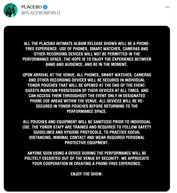"Todos los shows del lanzamiento de álbum de Placebo serán una experiencia libre de teléfonos. El uso de teléfonos, relojes inteligentes, cámaras y otros dispositivos que graben, no serán permitidos en el espacio de presentación", explicaron en Twitter.