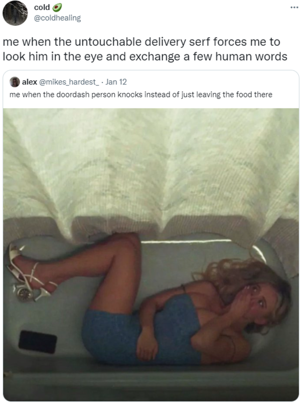 Asimismo, a la actriz se le mostró otro meme que la mostraba escondida en un baño durante una fiesta. “Yo cuando la persona de Doordash llama a la puerta en lugar de simplemente dejar la comida allí”, se lee en el meme.