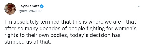 A través de sus redes sociales, Taylor Swift criticó la decisión de la Corte Suprema de derogar el fallo en el caso Roe vs Wade. La cantante, que se ha mostrado a favor de los derechos reproductivos de las mujeres, confesó estar aterrada con lo ocurrido.