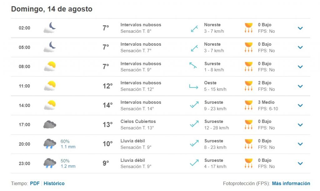 Según informan diferentes medios especializados en meteorología, las precipitaciones podrían llegar el próximo domingo 14 de agosto, a altas horas de la noche. Extendiendose hasta la madrugada y primeras horas del lunes.