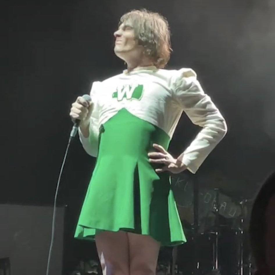 En la ocasión, el músico decidió sorprender a los fanáticos explorando un poco con su look. Y es que, lejos de los pantalones negros apretados y las camisas de la escena emo, el cantante apareció con un traje de porrista.