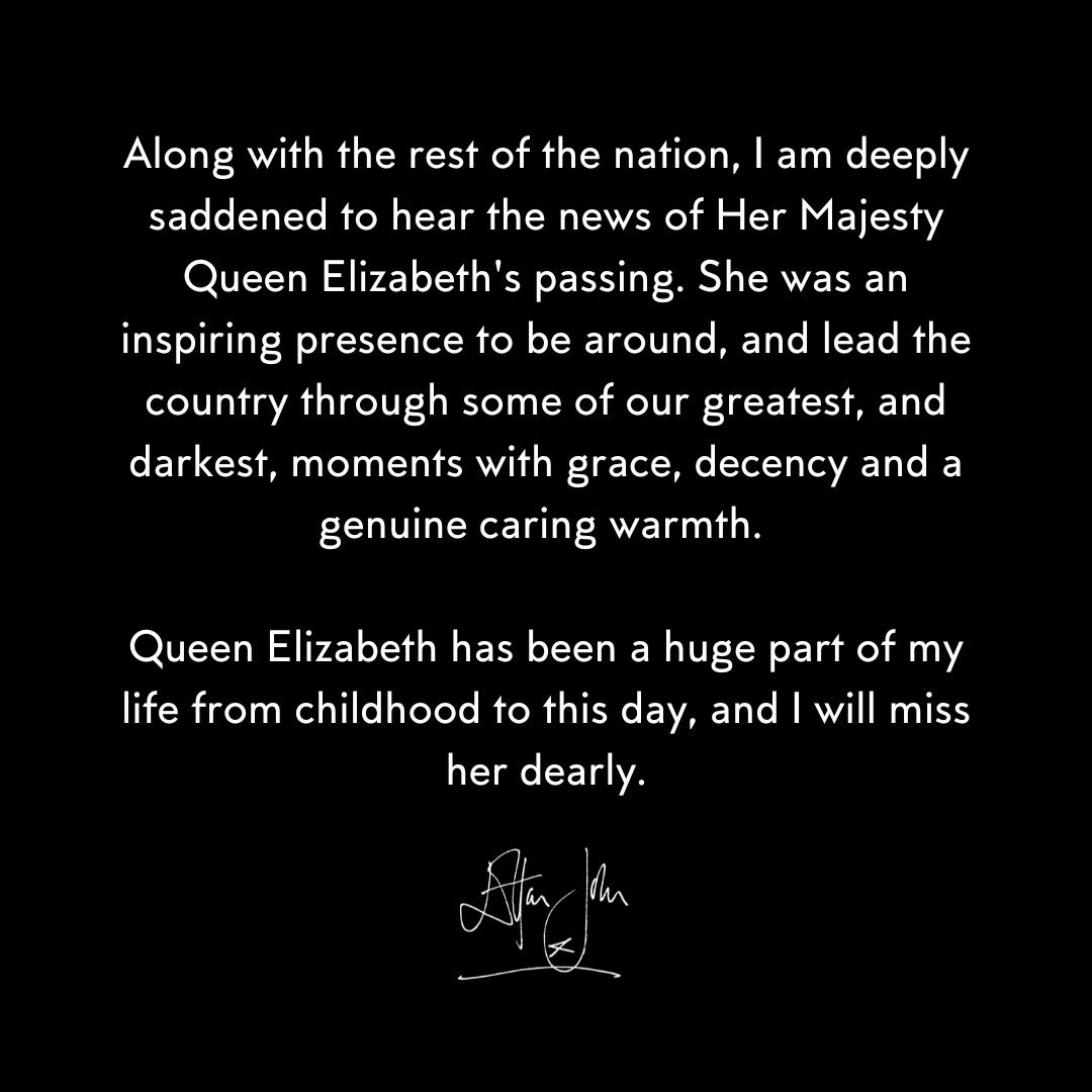 Sir Elton John fue uno de los primeros en referirse a la partida de la monarca, usando sus redes para darle tributo. "Junto con el resto de la Nación, me entristece profundamente escuchar la noticia del fallecimiento de Su Majestad la Reina Isabel II", escribió el interprete de Rocketman.