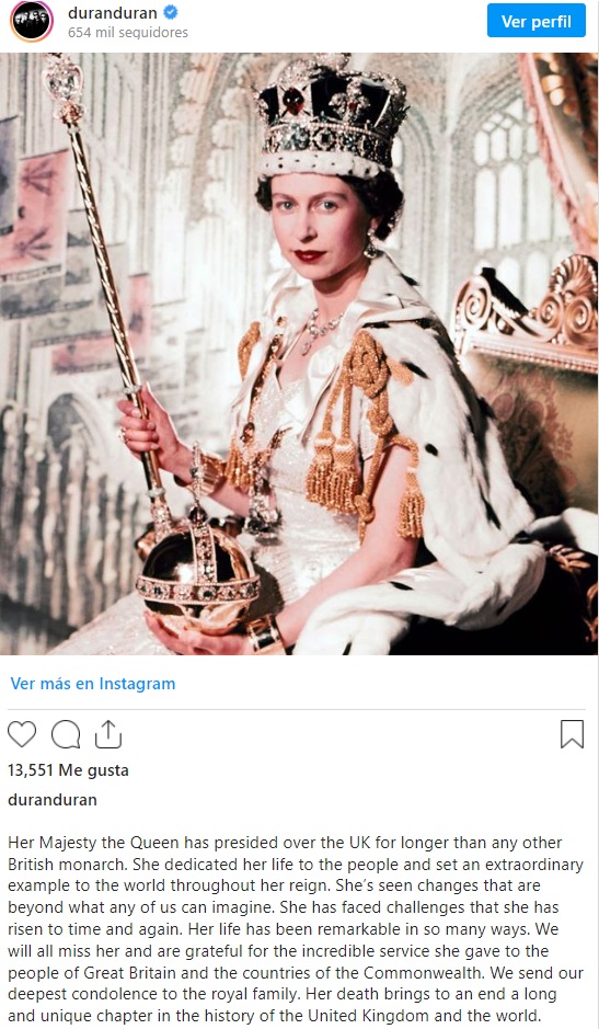 Duran Duran fueron otros que dieron un largo mensaje tras la muerte de la Reina Isabel II. "Dedicó su vida a la gente y dio un ejemplo extraordinario al mundo a través de su reinado. Ha visto cambios que están más allá de lo que imaginamos", escribió la banda.