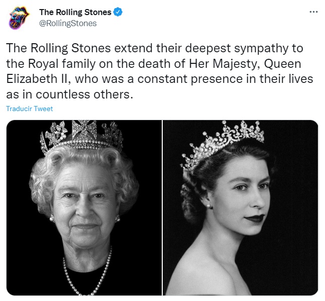"The Rolling Stones extiende su más profunda simpatía la Familia Real tras el fallecimiento de su majesta, la Reina Isabel II. Fue una constante presencia en nuestra vida y en incontables otras", escribió el grupo de Mick Jagger en sus redes.