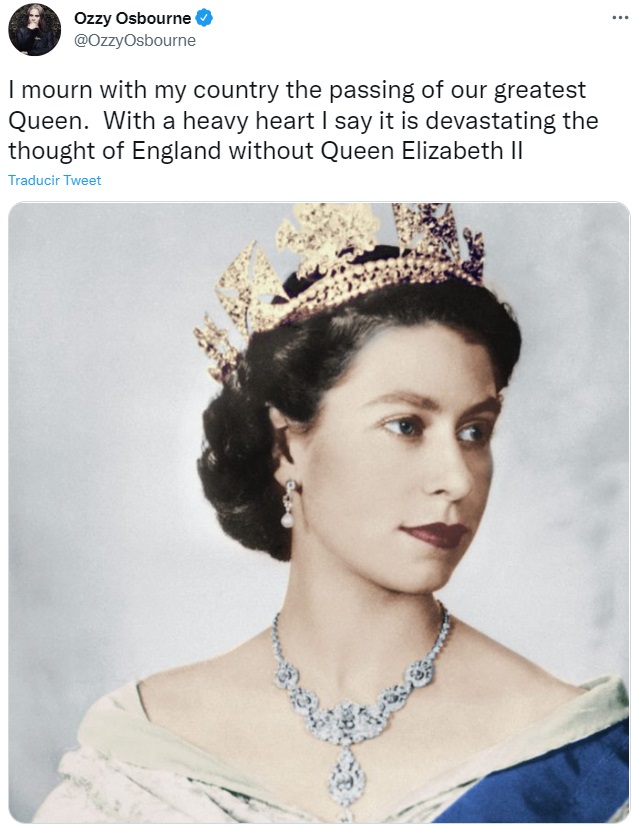 Ozzy Osbourne fue otra de las estrellas británicas que lamentó la partida de Isabel II. "Lamento junto a mi patria la partida de nuestra gran Reina. Con gran pesar digo que es devastador el pensar en Inglaterra sin la Reina", aseguró el icónico músico.