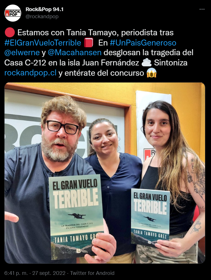 En una nueva edición de nuestro programa en Radio Rock And Pop, Un País Generoso, conducido por Iván Guerrero y Werne Núñez, conversamos con la periodista Tania Tamayo, autora del libro El Gran Vuelo Terrible. Investigación extensa sobre esta tragedia.
