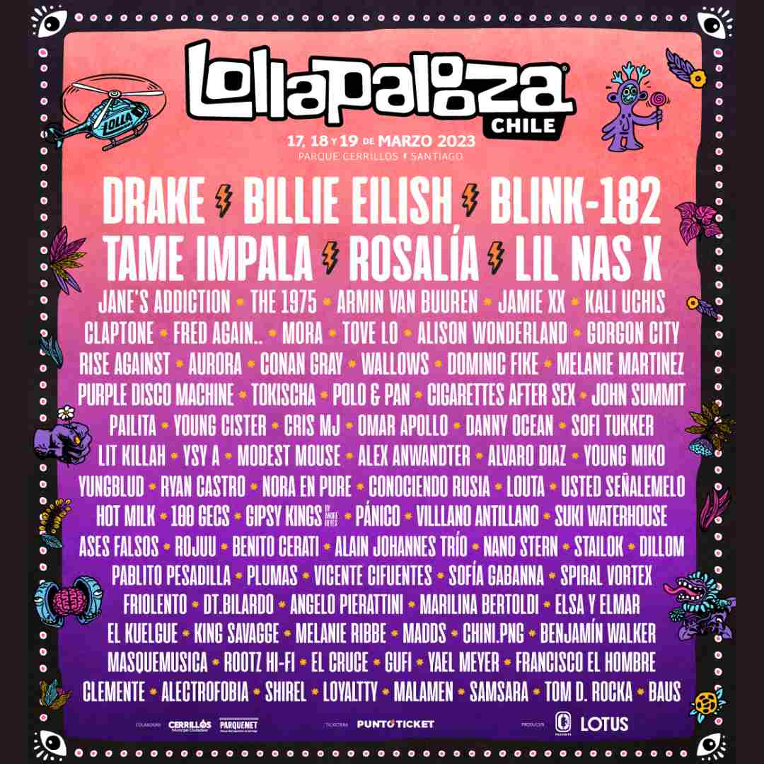 Drake, Billie Eilish, Blink-182, Rosalía, Tame Impala, Lil Nas X son los headliners del lineup de este año de Lollapalooza Chile 2023. En estos nombres, podemos ver el regreso de la icónica banda de Travis Barker, Tom DeLonge y compañía, mientras vemos a los nombres de cartel más jóvenes de su historia.
