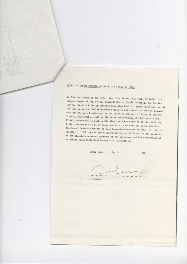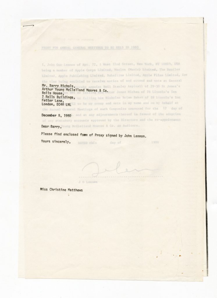 Aquella firma se muestra en un documento legal que se subastará este martes 4 de octubre. En aquella carta mecanografiada, se enumera a tres personas a las que John Lennon dio su poder para votar en una reunión anual de las corporaciones de The Beatles, la cual se iba a llevar a cabo 9 días después en Londres (Inglaterra).