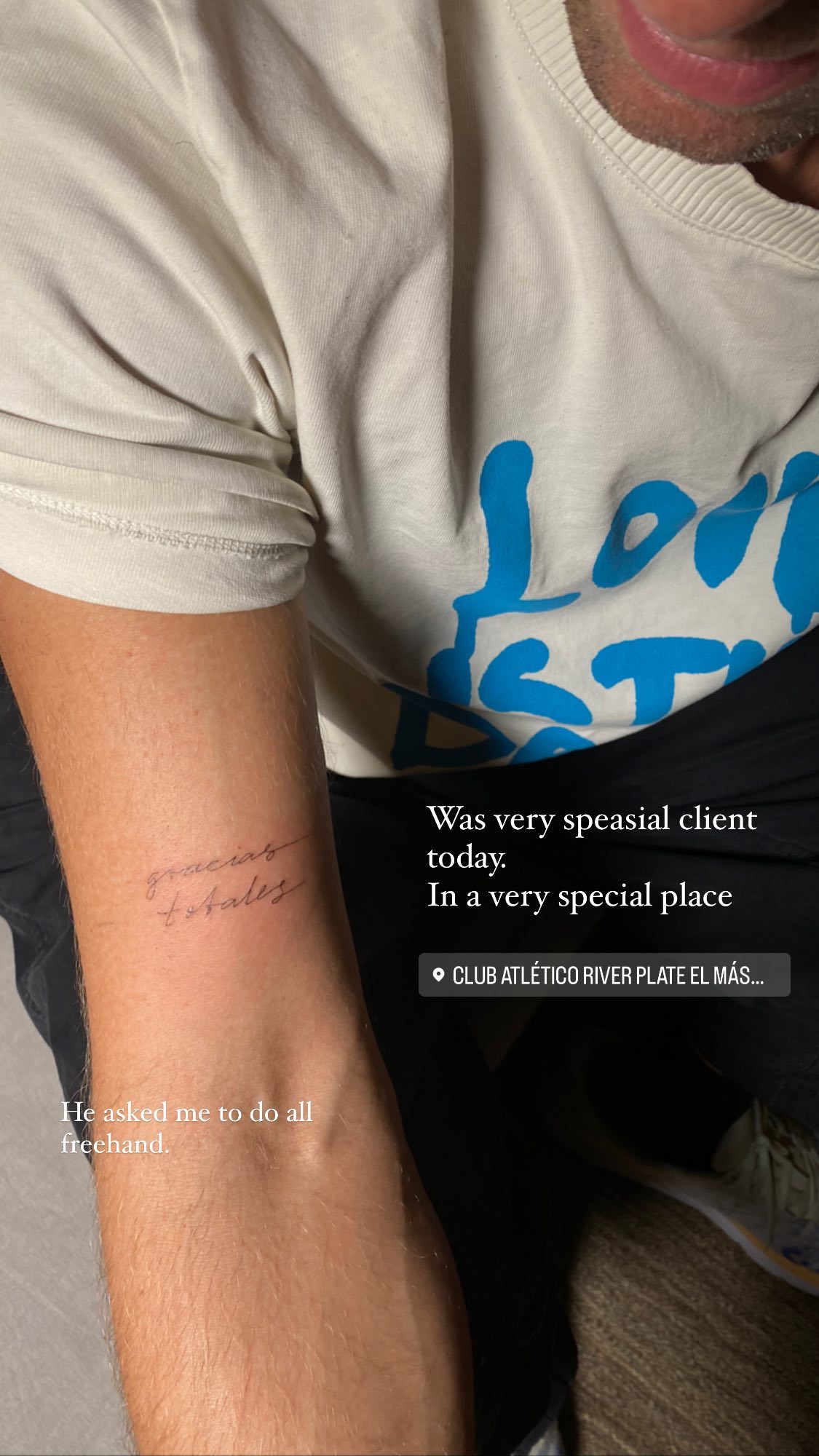 "Tuve a un cliente muy especial hoy. En un lugar muy especial", escribió la tatuadora. Así, reveló que hizo el emotivo tatuaje en el Estadio River Plate, donde darán su décimo y último concierto este martes 8 de noviembre.