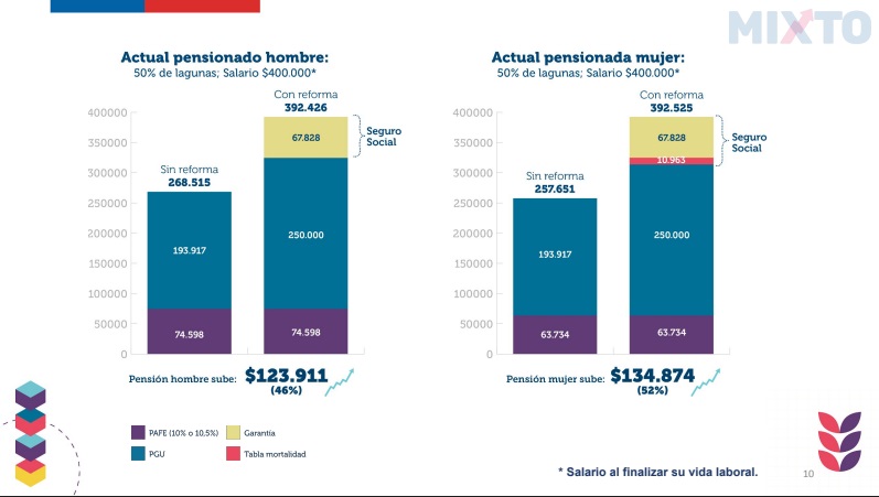 En el caso de la mujer, donde se agregará la tabla de mortalidad para eliminar la discriminación por género, esta pasaría de $257 mil a $392 mil con la nueva reforma. Cabe señalar que lo anterior se complementará con el aumento de la Pensión Garantizada Universal (PGU), que subirá a $250 mil. Sin embargo, todo dependerá si se aprueba la reforma de pensiones.
