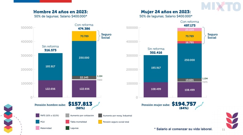 Para entender mejor la reforma de pensiones, el Gobierno dio algunos ejemplos de cómo mejorarían las renumeraciones de jubilados. Un hombre con un 50% de lagunas y salario de $400 mil al finalizar su vida laboral, pasará de $268 mil a $392 mil con esta reforma.