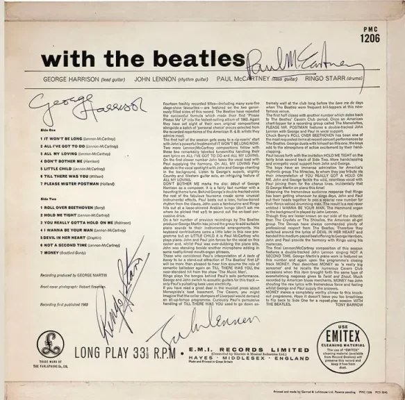 Otro de los artículos que estarán disponibles es un álbum "With the Beatles". Esta copia física estará firmada por John Lennon, Paul McCartney, George Harrison y Ringo Starr. También habrá un juego de caricaturas firmado por los cuatro Beatles.