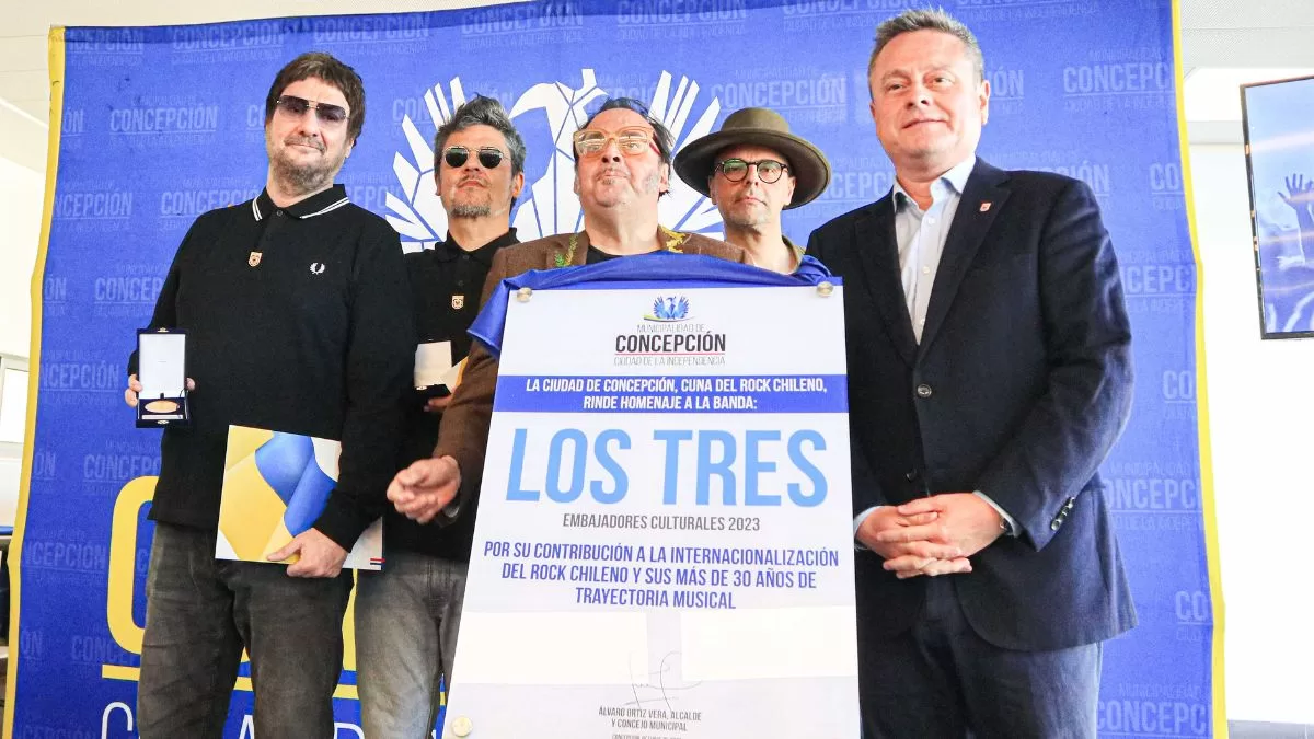 "Hoy a esta banda local también se le reconoce con este tremendo y multitudinario recital prácticamente avisado con 24 horas de anticipación", expresó el alcalde Álvaro Ortiz. El título de Embajadores Culturales se le otorga a Los Tres en medio de la espera de los resultados a la postulación para que Concepción sea reconocida como Ciudad Creativa de la Música por la Unesco.