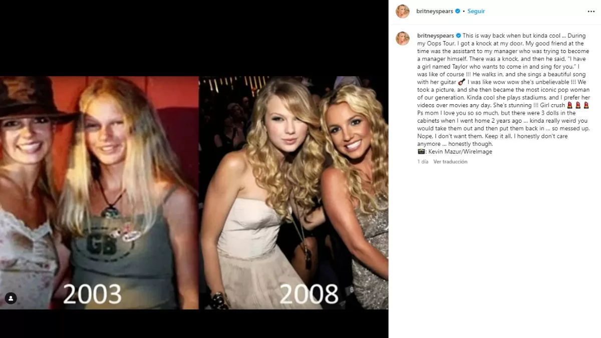 "Ella cantó una hermosa canción con su guitarra. Yo estaba como '¡¡¡guau, ella es increíble!!!'. Nos tomamos una foto y luego se convirtió en la mujer pop más emblemática de nuestra generación", relató Britney Spears a través de su Instagram. Después de felicitar a Taylor Swift, Spears añadió: "Ella es maravillosa. Es mi amor platónico femenino".