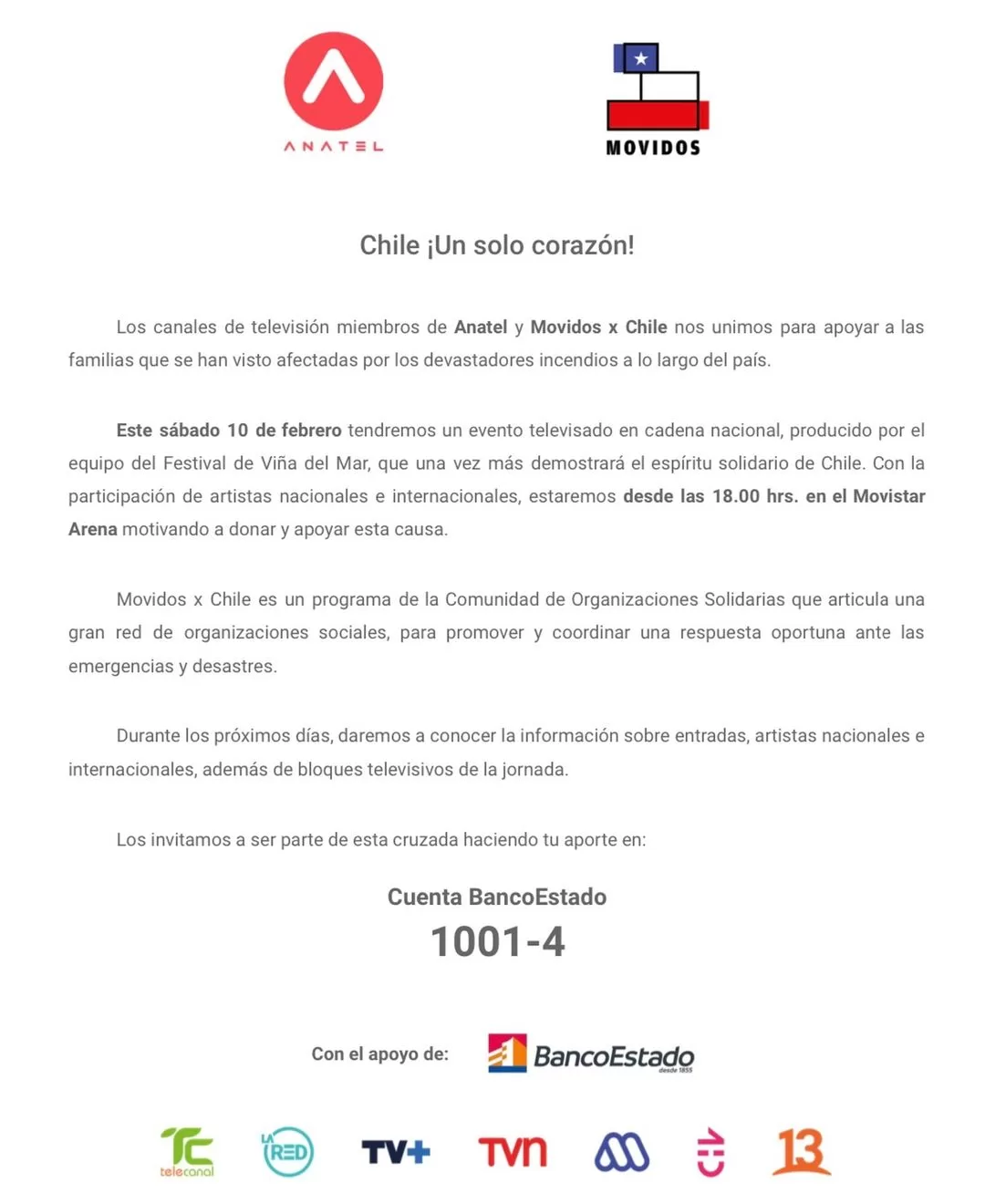 "Los canales de televisión miembros de Anatel y Movidos x Chile nos unimos para apoyar a las familias que se han visto afectadas por los devastadores incendios a lo largo del país".