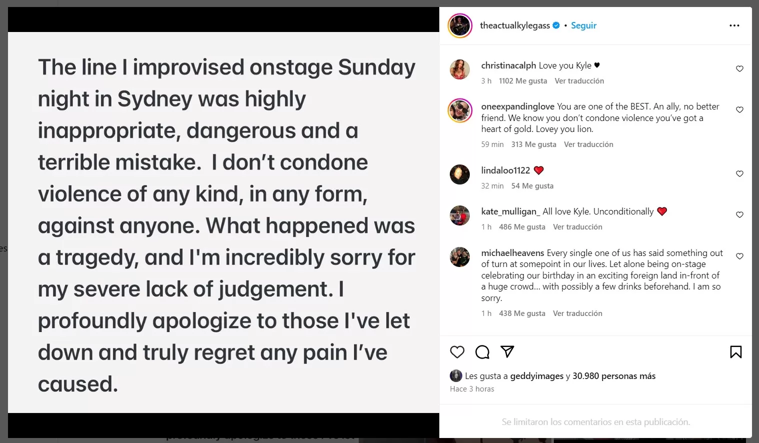 "La frase que improvisé en el escenario el domingo por la noche en Sydney fue muy inapropiada, peligrosa y un terrible error", escribió. “No apruebo la violencia de ningún tipo, de ninguna forma, contra nadie".