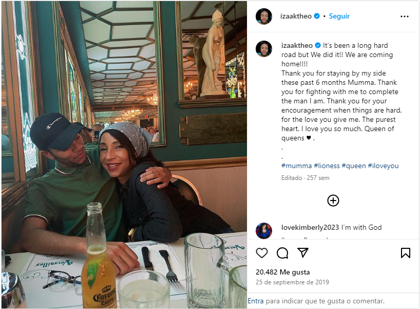 En esa ocasión, el modelo de 27 años publicó una foto junto a su madre Sade en Instagram, donde derrochó amor por ella y se mostró feliz por culminar dicha etapa. "¡El camino ha sido duro pero lo hemos superado!, ¡Volvemos a casa! Gracias por estar a mi lado durante los últimos seis meses, mami. Gracias por luchar conmigo para ser el hombre que soy", escribió.