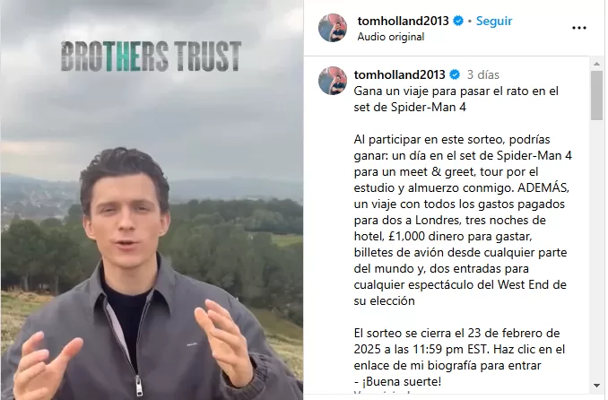 Es así como en el post de Instagram se detalla: "Al participar en este sorteo, podrías ganar: un día en el set de Spider-Man 4 para un meet & greet, tour por el estudio y almuerzo conmigo. Además, un viaje con todos los gastos pagados para dos a Londres, tres noches de hotel, £1,000 dinero para gastar, billetes de avión desde cualquier parte del mundo y, dos entradas para cualquier espectáculo del West End de su elección".