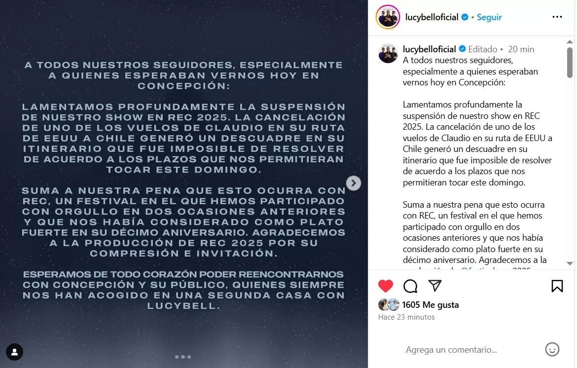 "Suma a nuestra pena que esto ocurra con REC, un festival en el que hemos participado con orgullo en dos ocasiones anteriores y que nos había considerado como plato fuerte en su décimo aniversario. Agradecemos a la producción de Festival REC 2025 por su compresión e invitación" agregó Lucybell.