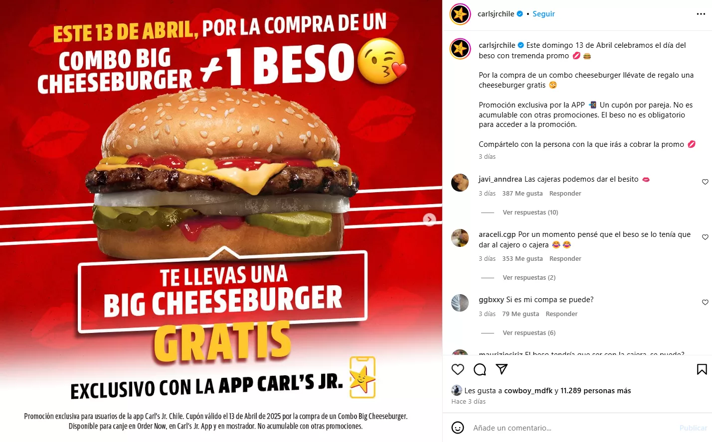 En locales de comida, como Carl's Jr., se realizará una promoción que indica que por la compra de un combo cheeseburger, se podrá llevar de regalo una cheeseburger gratis.