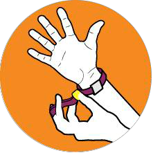 2.- Sujeta ambos extremos de ésta y jala el plástico negro hasta ajustarla. Recuerda no apretarla mucho! Debe quedar un dedo entre la pulsera y tu muñeca. Una vez ajustada la pulsera, no podrá ser abierta nuevamente, por lo que sugerimos sea puesta el día del ingreso al evento.