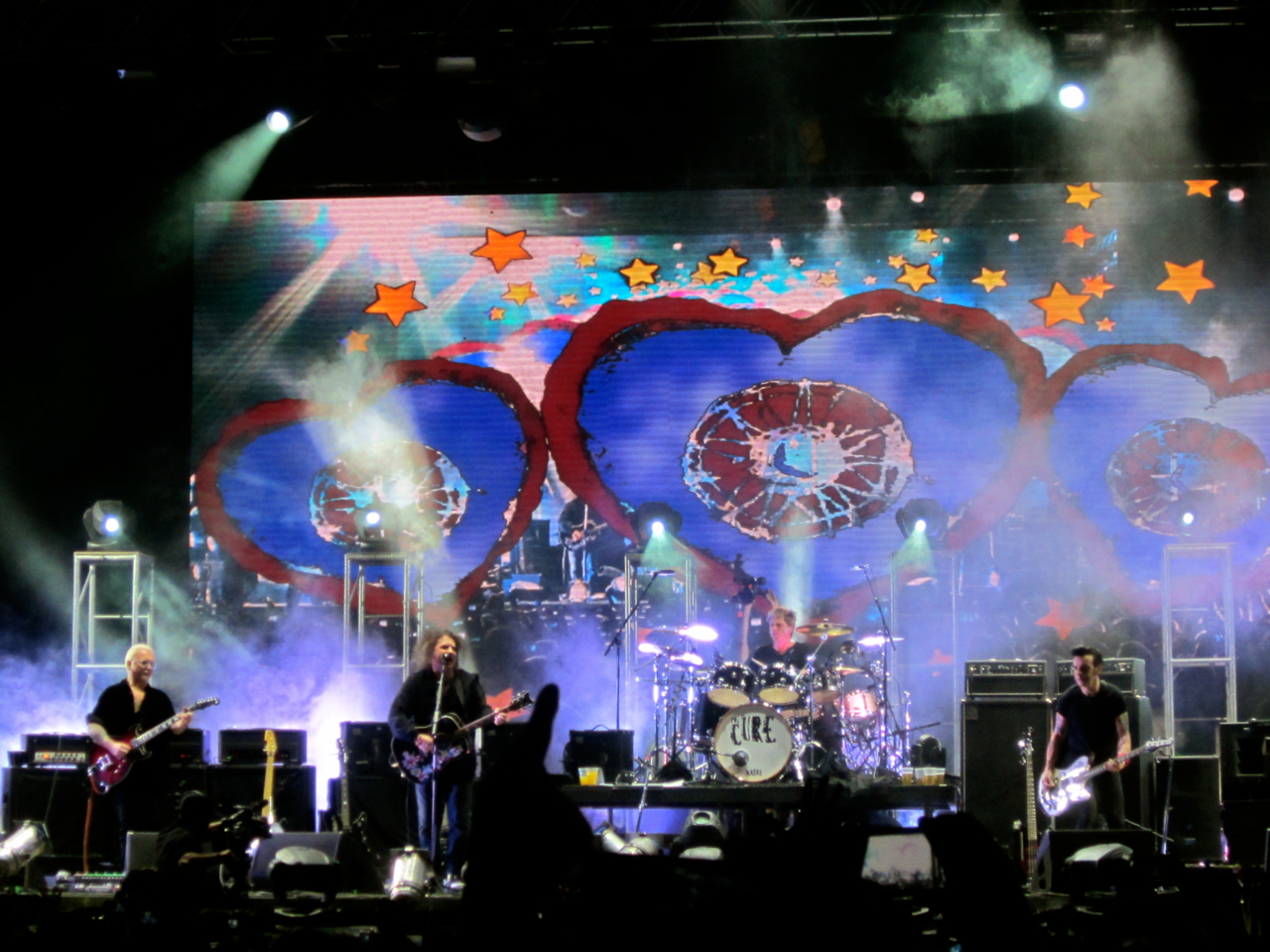 Y se viene The Cure. A esta altura, yo esperaba que entrara la banda primero y luego de un show de luces, humo y harta pirotecnia apareciera la gran estrella de la noche… Y no estuve ni cerca. Los músicos entraron todos juntos y Robert en medio de ellos, sin mucha ceremonia, muy respetuoso y saludando muy cordialmente antes de partir con “Open”. En ese momento se me cayeron todos los prejuicios, primero porque la calidad vocal de Robert Smith es impactante y, segundo, porque la banda suena un cañón más allá de la tecnología de sonido que se usa hoy. Si una banda es de cartón se nota y acá no fue el caso, son tremendos.