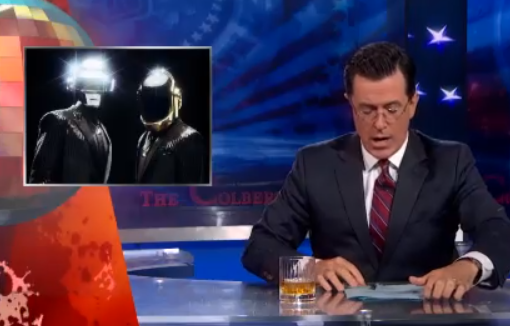 Stephen Colbert explicó al inicio de su programa que el duo no iba a poder presentarse puesto que MTV hace rato que maneja un contrato secreto con ellos para reservar su gran estreno en televisión para los Video Music Awards de este año, teniendo los derechos y reclamaciones exclusivas con cualquier show que hagan para cualquier pantalla.