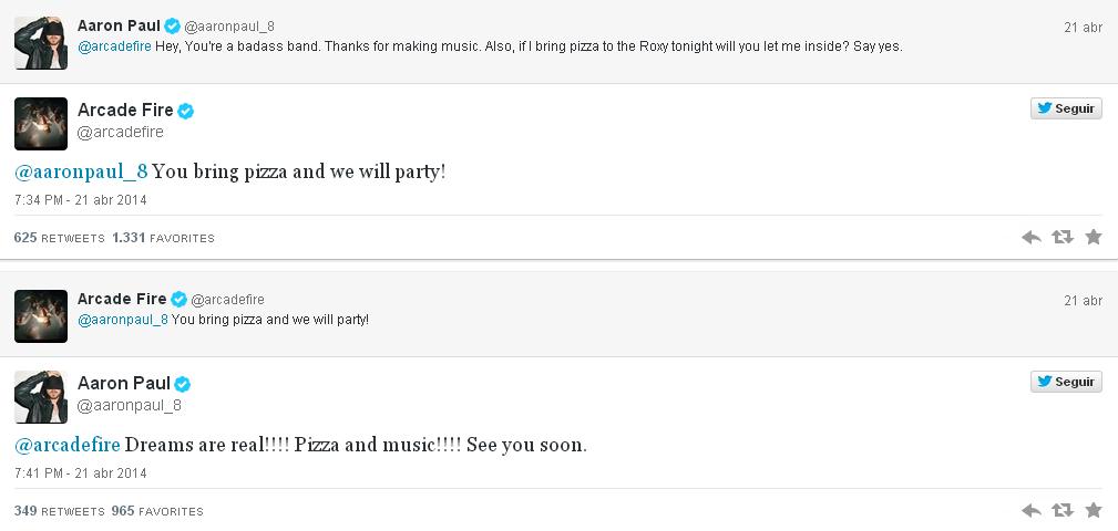 ¿Qué harían por ver a su banda favorita? Sin duda que cada vez que puedas irás a verla en vivo, obvio. Bueno, Aaron Paul (conocido por interpretar a Jesse Pinkman en la tremenda serie "Breaking Bad"), ama con fervor-locura-pasión a Arcade Fire. Pero el reciente encuentro entre la banda y el actor fue genial: por un par de pizzas, ¡pudo entrar a verlos a un show íntimo en el Roxy (Los Ángeles, California) el lunes pasado! (El que puede, puede), afortunado entre las 500 personas que estaban en el lugar...