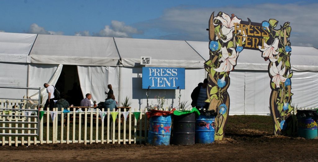 La internet vuela en la sala de prensa, los lockers y el café son gratis. Esa Press Tent queda justo detrás de los escenarios Pyramid Stage y The Other Stage, está rodeada de casas rodantes y junto a una especie de plaza con muchos restoranes, pubs y bares muy top. Todo desarmable. Es un lugar reservado para prensa y staff. Tiene rápidos accesos a las principales avenidas que atraviesan Glastonbury y permite además encontrarse de repente con personajes de la farándula local y mundial. Por ahí muy temprano en la mañana me toco ver una vez al Príncipe Harry, y al año siguiente me tope cara a cara con Emma Watson y Gwyneth Paltrow.