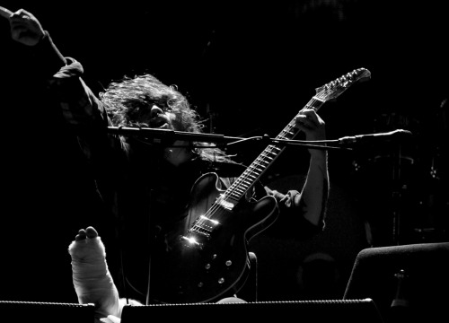 Mientras yacía allí de espaldas, pensé, "¿Estás bromeando? ¿Ni siquiera hemos llegado al punto más gritón de la canción y el concierto se tiene que ACABAR?" Entonces, pedí un micrófono y le dije a la audiencia que me dejaran arreglarme y volver para terminar el show lo antes posible. ¿Shockeado? Probablemente. Pero, no podía soportar la idea que una noche perfecta se echara a perder. Miré a nuestro baterista Taylor y le dije: "Lánzate algunos covers de Chevy Metal y cúbreme mientras me arreglan" Así que, ya con la banda tocando "Stay With Me" de The Faces, los médicos me tiraron en una camilla, me llevaron a un lado, cortaron mis pantalones favoritos (muy fastidioso) y pusieron mi tobillo en su lugar. Les pregunté si podía volver al escenario para terminar el show, pero me dijeron que necesitaba un yeso (Estaba a 20 minutos del hospital) para sujetar el tobillo en su lugar. Así que miré a mi enfermero, Johan, a los ojos y le dije: "Bueno, entonces me llevas para arriba y te quedas allí conmigo para mantener el tobillo en su lugar hasta que puedan traer especialistas. ¿Listo?" Me miró con los ojos abiertos por un segundo y dijo:" Está bien, vamos"