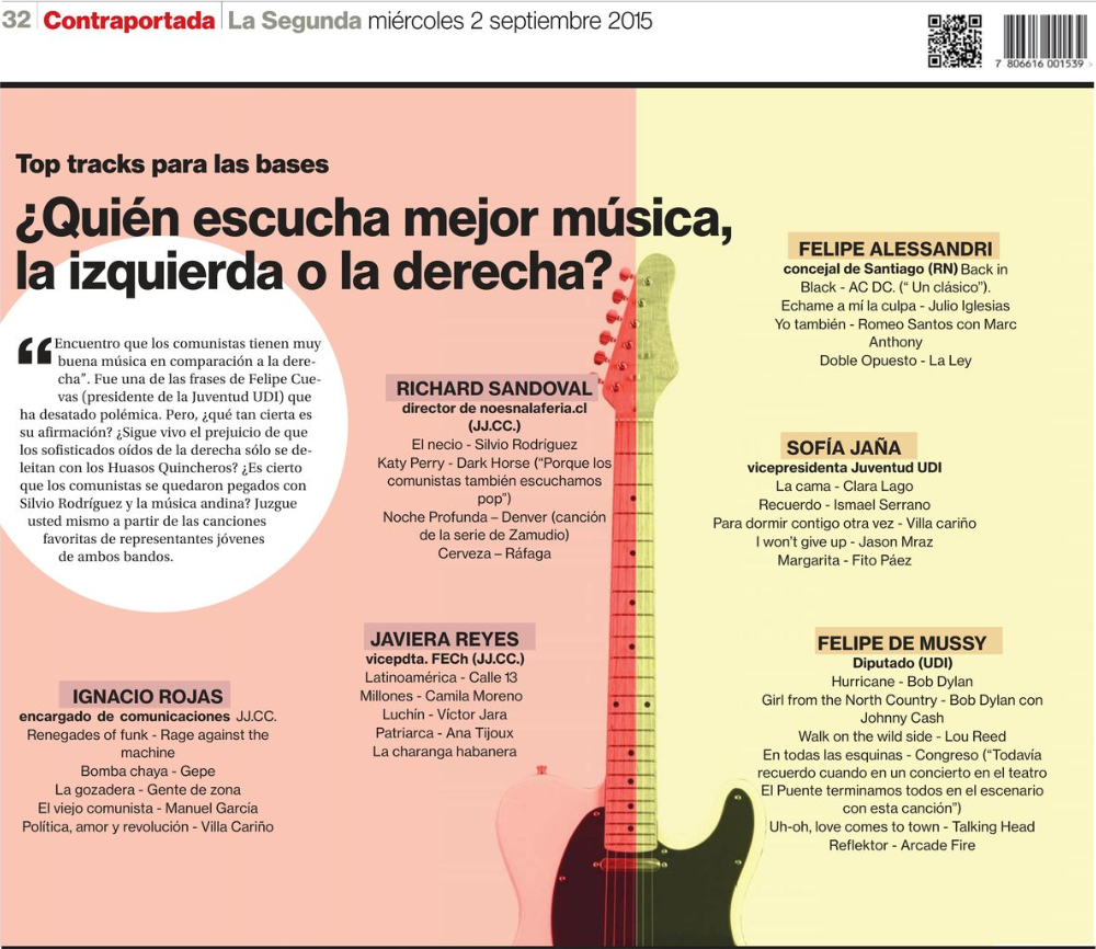 Hoy la contraportada del diario La Segunda nos sorprendió, pues puso a uno u otro lado de la vereda política a una serie de grupos y canciones. Todo esto, a propósito de los dichos del presidente de la Juventud UDI Felipe Cuevas, quien en una entrevista con The Clinic afirmó que "los comunistas tienen muy buena música en comparación a la derecha".