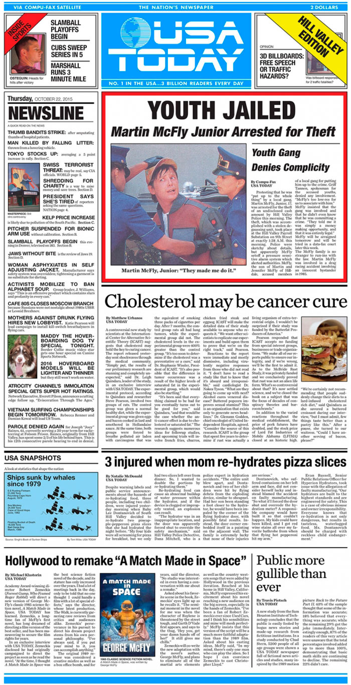 Hoy es el día en que Marty McFly nos viene a visitar para cambiar el destino de su hijo, y a eso de las 16:29, se aparecerá en Hill Valley. Por lo mismo el diario estadounidense lanzó una portada especial el día de hoy (y la que todos sabemos ocurrirá "mañana" en realidad).
