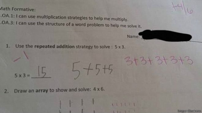En Reddit se subió una foto de la prueba de un niño de tercer grado de Estados Unidos, donde una profesora da por errónea la respuesta a un ejercicio donde se pedía que se utilizara la estrategia de la suma repetida, para multiplicar 5x3.