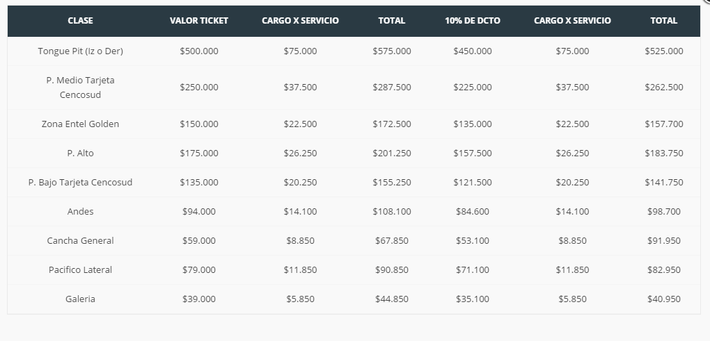 Preventa exclusiva y limitada para clientes de la zona Entel que paguen con tarjeta Cencosud (Paris, Jumbo, Easy), con un 10% de descuento sobre el valor de las entradas. La presente preventa es valida desde el 06 de nov 2015, hasta el 08 de nov. 2015, o hasta agotar stock de 24.000 tickets. Máximo de 4 tickets por transacción.