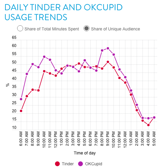 La empresa Nielsen hizo un exhaustivo análisis del comportamiento de los usuarios de aplicaciones para encontrar pareja. ¿La conclusión? si no va muy bien la cosa en Tinder y no estás consiguiendo tantos“matches” como esperabas, quizás sea por que lo estás haciendo a una hora equivocada.