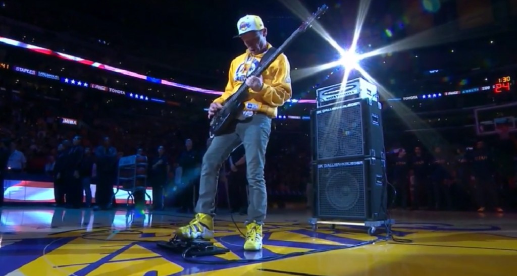 Y fue este ultimo quien tuvo una participación especial porque, como es costumbre en estos eventos deportivos norteamericanos, se armó con su instrumento y se subió a tocar el himno nacional.