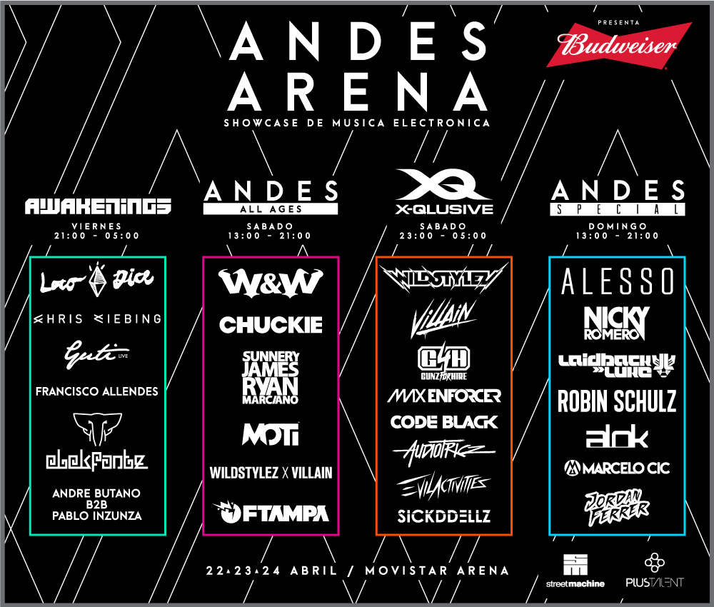 Una experiencia sin precedentes es lo que se viene entre el 22 y el 24 de abril en el Movistar Arena: La primera versión de Andes Arena, un festival creado en nuestro país y que promete inolvidables jornadas de baile con grandes artistas nacionales e internacionales.