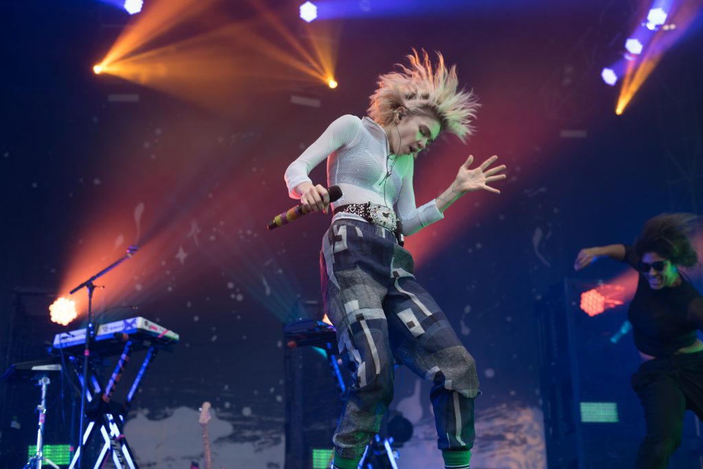 Esta gimnasta aterriza sobre el escenario armada de un par de teclados y un cuerpo de baile con mas energia que coordinación. Electrizante, colorido, acelerado y a veces frenético, Grimes se sacude, lanza patadas al aire, grita, va para allá, vuelve, no se detiene. Un hit tras otro, la gente prendida desde el primer bpm, todo muy arriba sin quiebres. Grimes ajusta botones de sus maquinas mientras no para de realizar movimientos extremos con su cuerpo. Electropop casi perfecto a no ser por un pequeño detalle: La duda si estaba tocando de verdad.