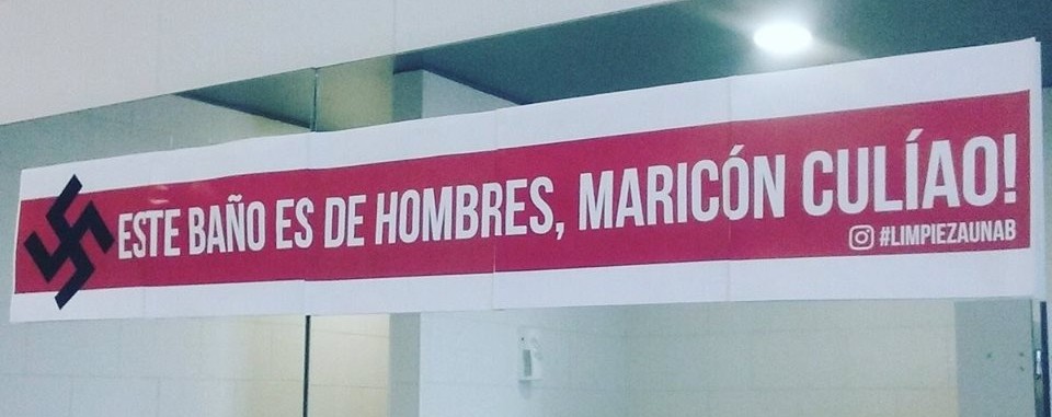 Una imagen captada en uno de los baños de la Universidad Andrés Bello rápidamente se viralizó esta mañana: "Este baño es de hombres, maricón culiao", rezaba el cartel pegado en el espejo, junto a una esvástica, tradicional símbolo nazi y un hashtag, #LimpiezaUNAB.