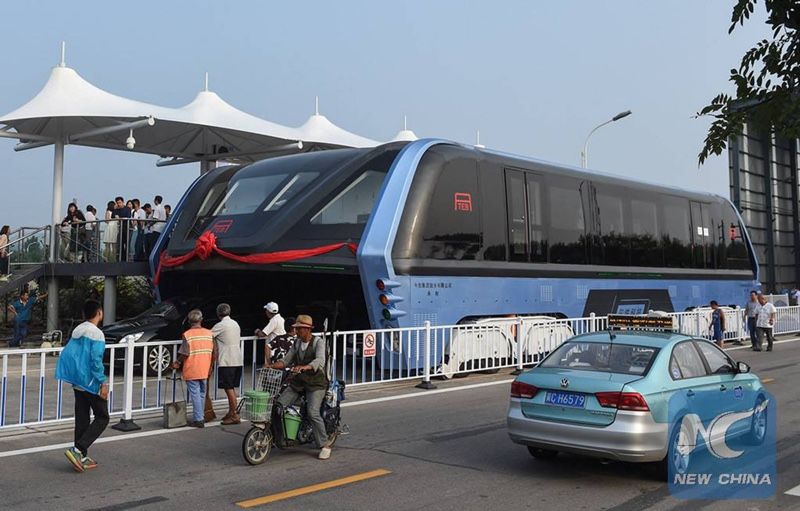 El TEB (de “Transit Elevated Bus”) es un bus de 22 metros de largo y 5 de alto que deja espacio entre el suelo y la cabina de pasajeros para que los autos pasen por abajo, dando la impresión de ser como un túnel en movimiento que, la semana pasada, comenzó a probarse sobre un trayecto de 300 metros en la ciudad de Qinhuangdao, al este de Pekín.
