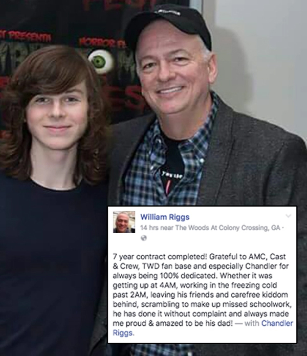 “¡7 años de contrato terminados! Agradecido de AMC, del elenco y del equipo, de los fans de TWD y especialmente de Chandler por siempre estar dedicado al 100%. No importa si tenía que levantarse a las 4 de la mañana, trabajar bajo el frío congelador pasadas las 2 de la mañana, dejar a sus amigos y una adolescencia normal y libre, luchando por recuperar las tareas del colegio. Él ha hecho todo sin quejarse y siempre ha conseguido que me sienta orgulloso y maravillado de ser su padre”, escribió Riggs en el posteriormente eliminado posteo.