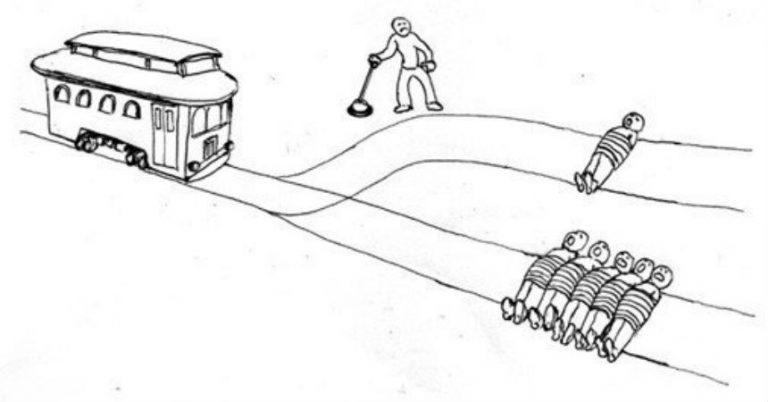 Imagina que un tren se ha averiado y va a toda velocidad, sin frenos, hacia cinco trabajadores que se encuentran en las vías. No puedes avisarles de ninguna manera ni parar el tren, lo único que está a tu alcance es una palanca que si se acciona lo desvía hacia otra vía, donde hay otro trabajador que está solo. ¿La accionas y lo matas para salvar a los cinco?