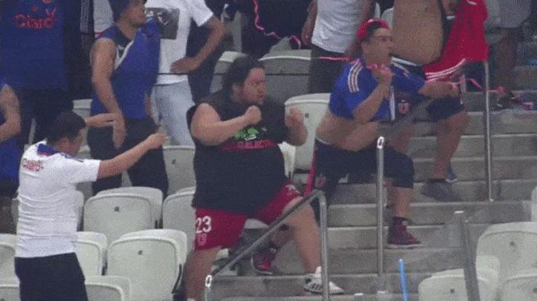 El joven acompañó hasta Brasil a su equipo, pero con el resultado en contra y los gritos de los hinchas locales, perdió el control y ofreció combos a diestra y siniestra (?), lo que quedó inmortalizado por las cámaras que transmitían el partido.