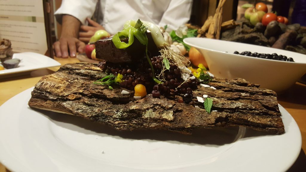 En el Hotel Las Torres trabajan con su huerta, por lo que el 30% de sus productos son de elaboración propia. Los platos poco a poco se han hecho mucho más gourmet y algunos se acercan a lo que hacen en el Boragó (en terminos de puesta en escena). Mucha quínoa, mote, legumbres, cordero, carnes con berries y cremas de la estación son parte de la carta.