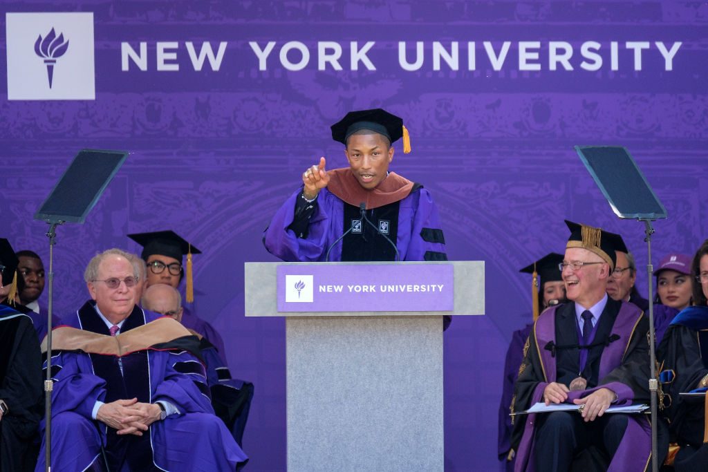 Pharrell recibió su grado honorario de Doctor of Fine Arts en la Universidad de Nueva York, ocasión en la que aprovechó de dar un discurso a los estudiantes que comienzan sus estudios en aquella institución resaltando la importancia de la igualdad de género.