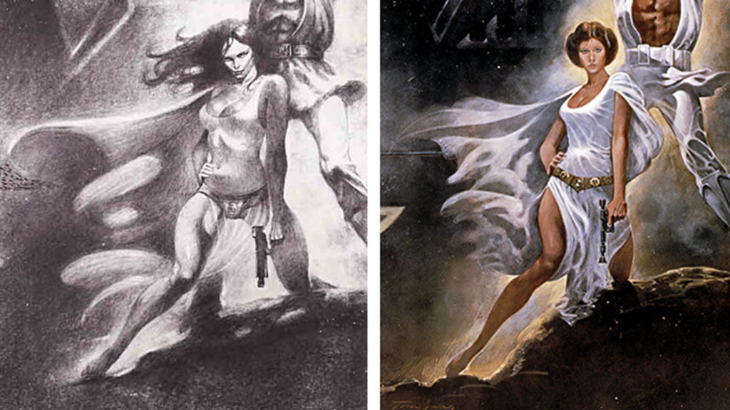 ¿La capa que usa Leia en el póster? Ese fue un detalle altamente discutido, siendo objeto de muchos cambio hasta su forma final. Incluso, el bosquejo original mostraba a la Princesa con mucha menos ropa que la que finalmente quedó en el dibujo.